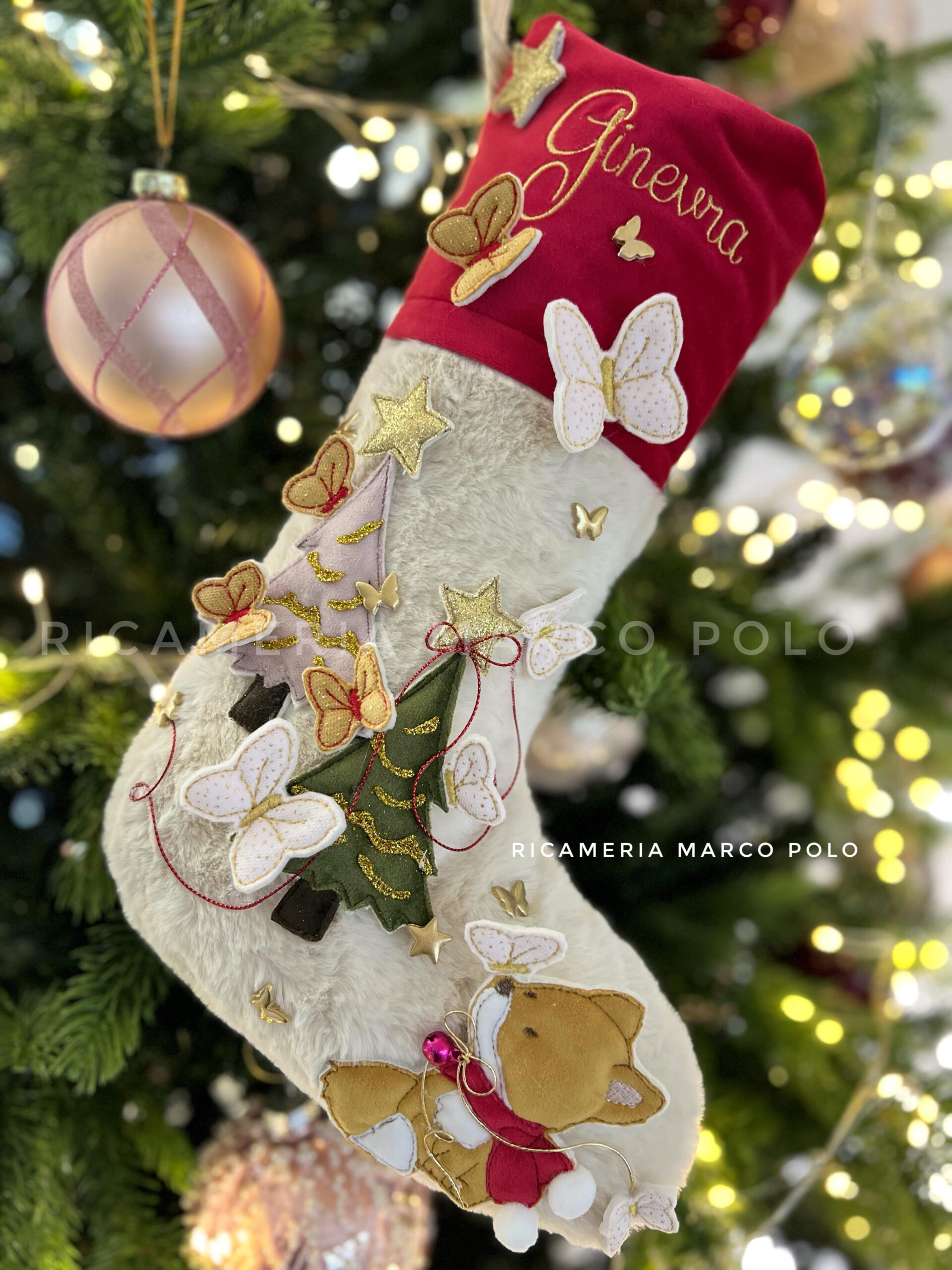 Calza della Befana o Calza Natalizia? A te stabilirne l’uso, per noi vanno bene per ambedue le feste, cambia solo il contenuto che vuoi mettere dentro. La calza in foto è realizzata in peluche panna e fascia in velluto rosso, con un volpe con sciarpa e due bellissimi abeti decorati tutti a mano e tante farfalline in velluto. Stelline dorate completano la calza.